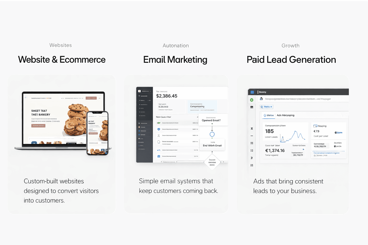 Our mission is simple: Build assets, set up automated marketing, and run ads that turn your traffic into leads and sales, so you can focus on growing your business.